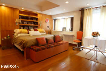 • Built-in floor to ceiling cabinets line an entire wall of the bedroom; across the bed, a media unit with side cabinets provide additional storage