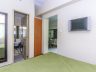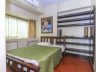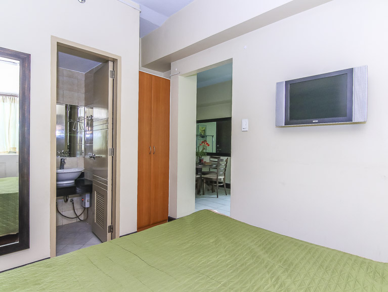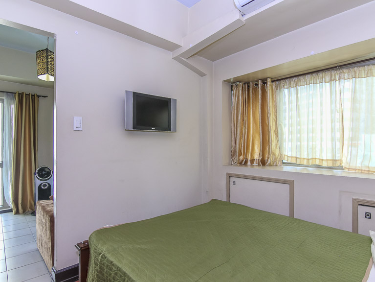 - The bedroom is furnished with a queen-sized wooden bed, a flat screen TV mounted on the wall by the foot of the bed, and a split-type air-con unit mounted above the windowed wall