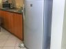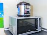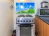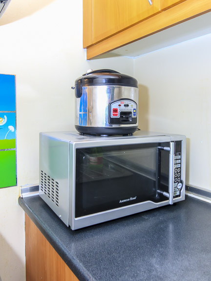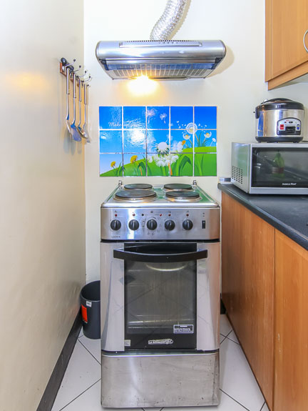 - The kitchen is furnished with a refrigerator, microwave and a four-burner electric range with the suspended range hood above it. Base cabinets under black granite counter top, and mounted wall cabinets provide kitchen storage spaces
