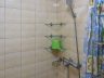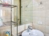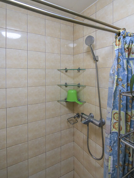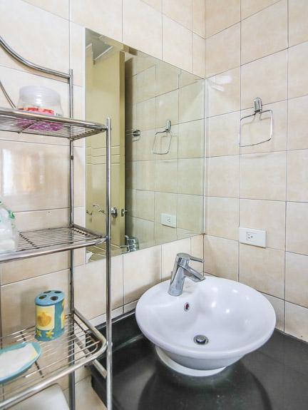 - The beige-tiled bathroom has a vessel sink on top of a black marble counter, and on the wall above it is a wide mirror. A three-layered stainless steel rack stands next to the sink. Bathroom fixtures include a hand-held shower and three corner-mounted floating shelves
