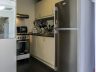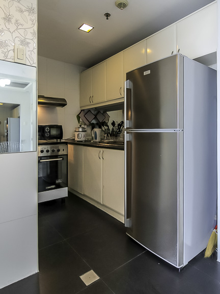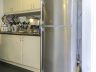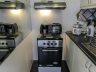 - Black granite counter top with cream colored base cabinets and wall mounted cupboards in a one-wall design; appliances include a two-door ref, electric range/oven, microwave