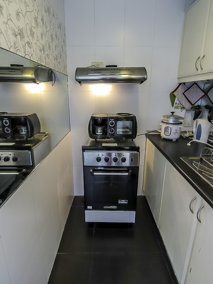 - Kitchen with black non-slip tile flooring and a mirrored wall creating an illusion of space