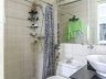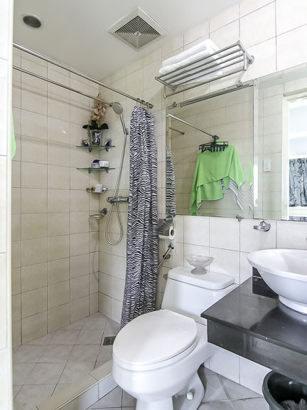 - Bathroom with a black granite counter, a white vessel sink, and a full mirror; fitting include a hand-held shower, glass corner shelves, shower curtain rod and a stainless-steel towel rack