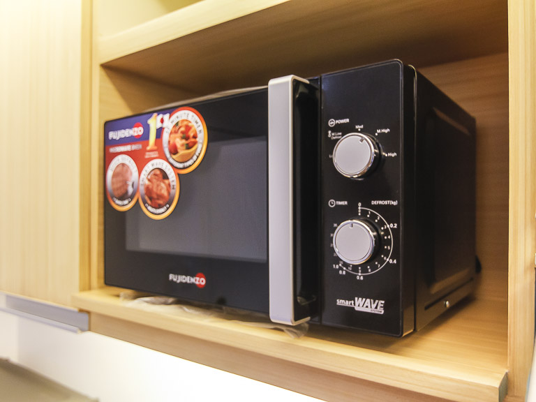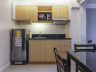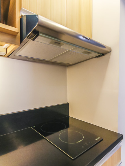 - Kitchen equipped with refrigerator, microwave and induction cooktop with hood