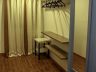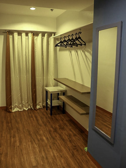 - On the wall across the foot of the beds are two floating shelves. A flat screen TV is mounted on the wall across one of the beds. A clothes hanger rod is suspended high above the floating shelves across the other bed
