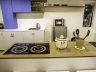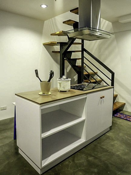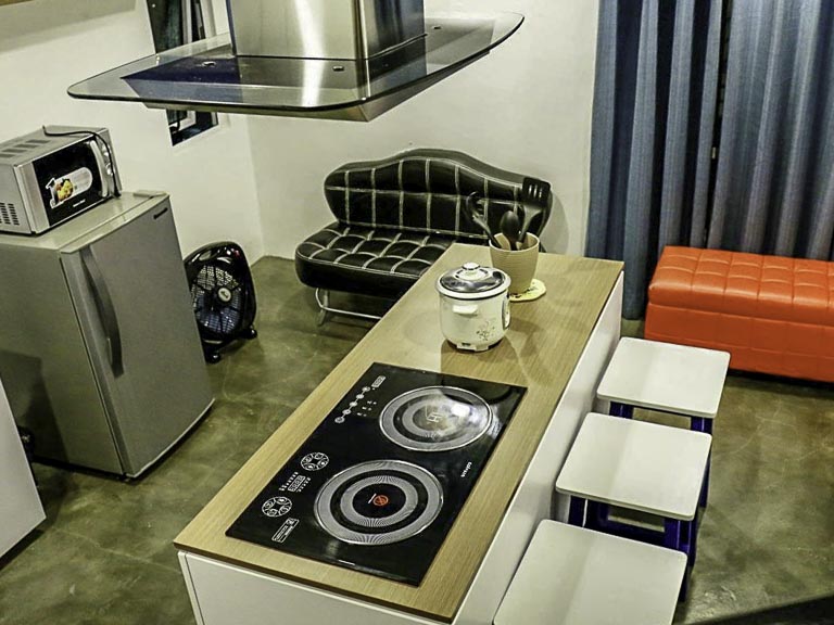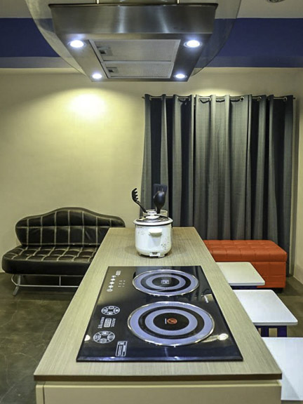 - A kitchen island counter with a suspended range hood above a two burner induction cooktop doubles as a breakfast bar with stools. Other kitchen appliances include a refrigerator and a microwave