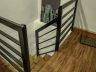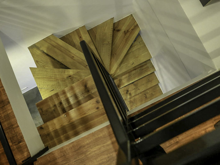 - The U-shaped wall-side wooden staircase with black metal railings lead up to the second level bedrooms, with the second-floor land railings creating the distance between the “bedrooms”
