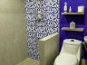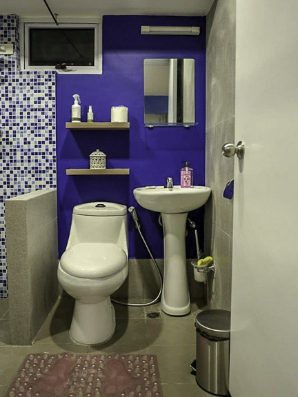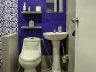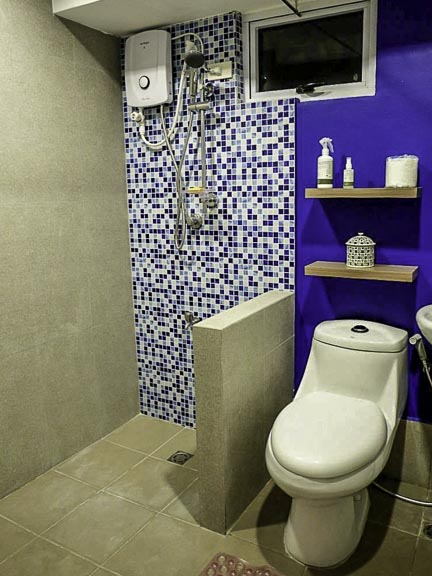 - The bathroom, with a pedestal sink, is accented by a blue wall with floating shelves. The rainfall shower and the water heater are mounted against a blue and white mosaic tiled wall