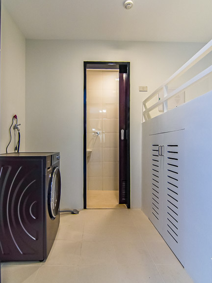 - The maid’s room sits next to the kitchen and has a bunk bed with storage, front load automatic washing machine, and a bathroom