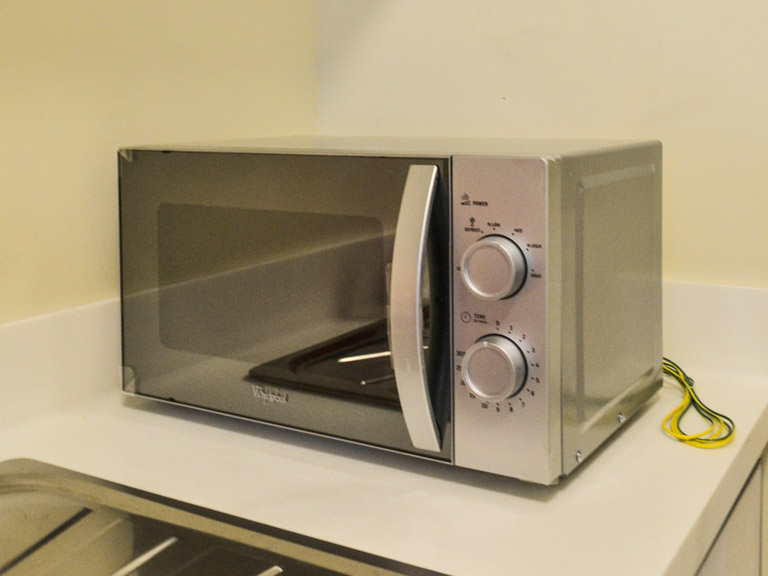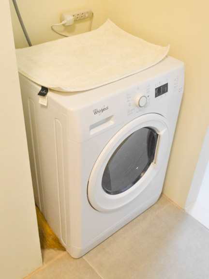 • Two-door fridge, electric range with hood, microwave oven, and front load washing machine