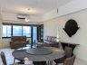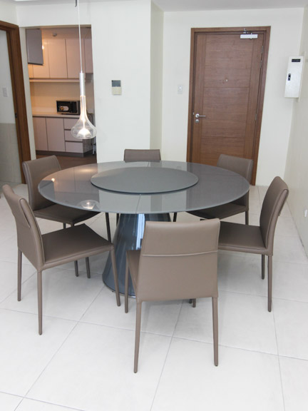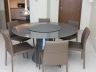 - The dining area is defined by the four-sitter round glass dining table with a lazy susan and beige upholstered dining chairs