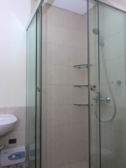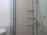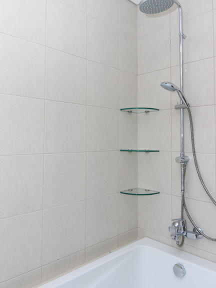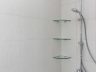 - Visible through the clear shower enclosure is a handheld shower and floating corner shelves for bathroom essentials.