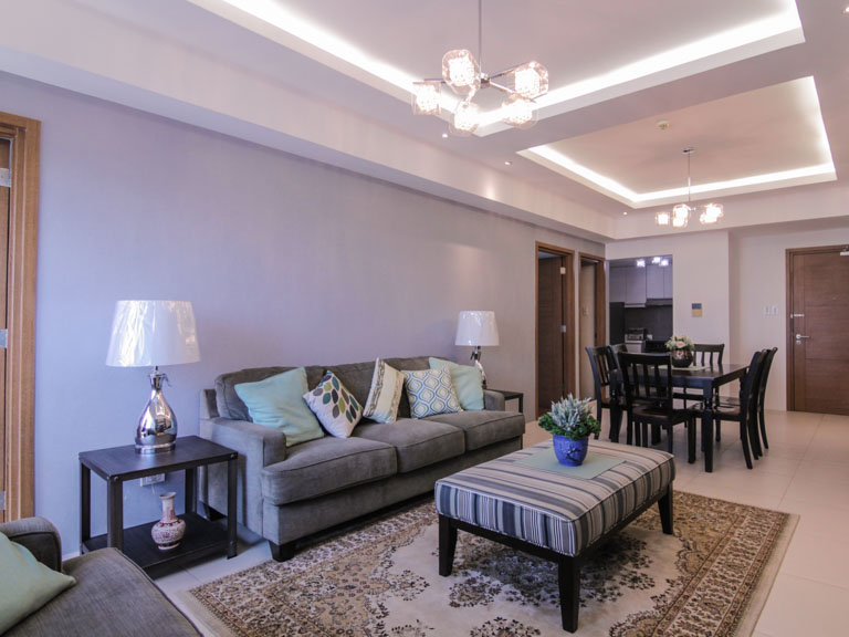 - The living area contains a 2-piece living room set, tufted coffee table, lounge carpet, and a large flat-screen TV