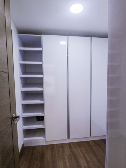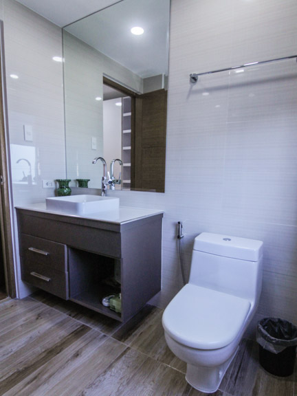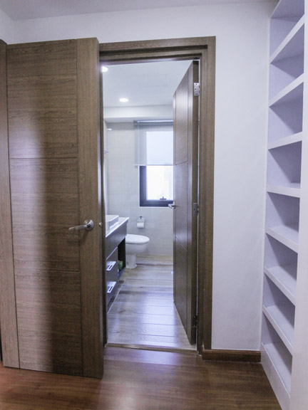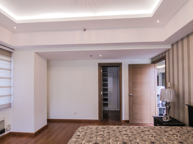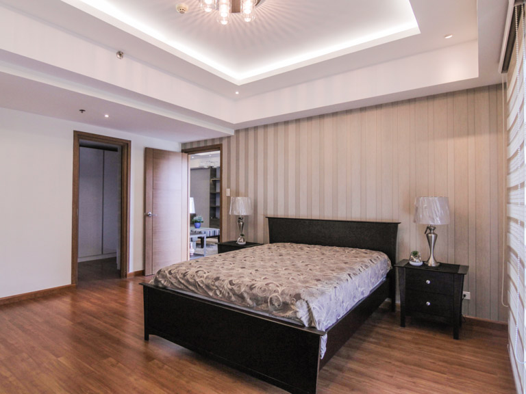 - The master bedroom is fitted with a queen-sized bed, twin side tables with lampshades, and walk-in closet that also leads into the bathroom