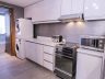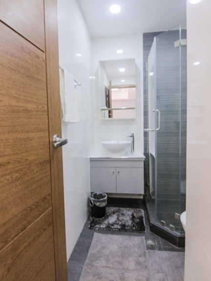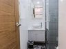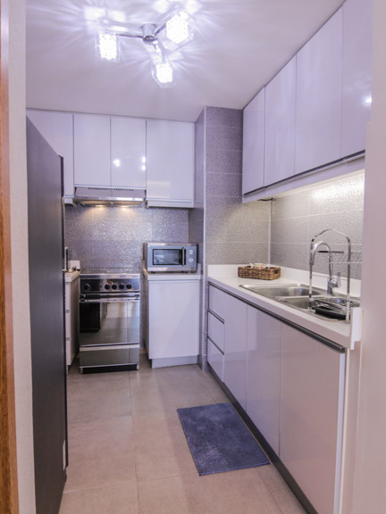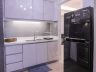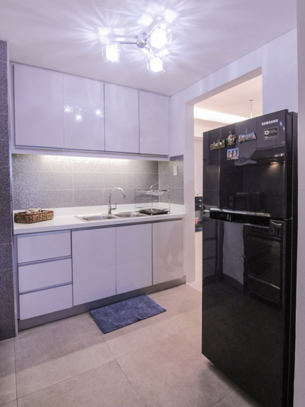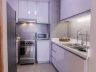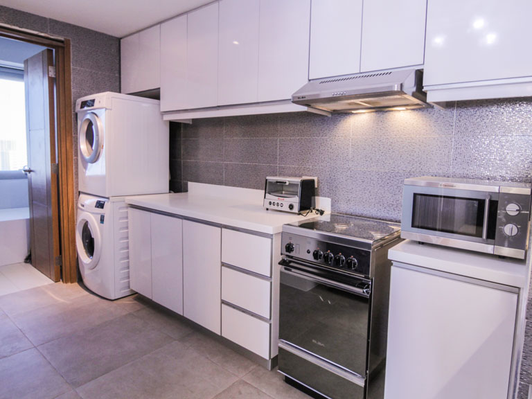 - The kitchen is equipped with a two-door ref, electric cooking range with hood, microwave, oven toaster and stacked front load washer and dryer