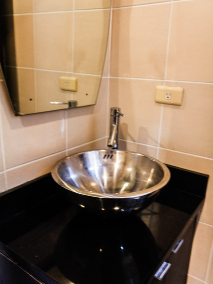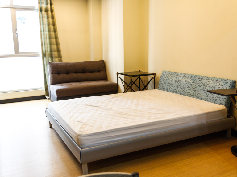 • Ventilation and natural light in the ‘bedroom’ comes from the glass panel window wall. At its corner near the bed is a light-brow armless fabric sofa