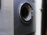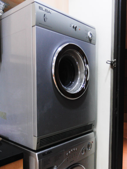 • The single wall kitchen with black marble countertop is flanked by the refrigerator on one end and the stack-up washing machine and dryer on the far end. Ginger-colored cupboards and base cabinets provide multiple storage space