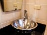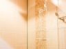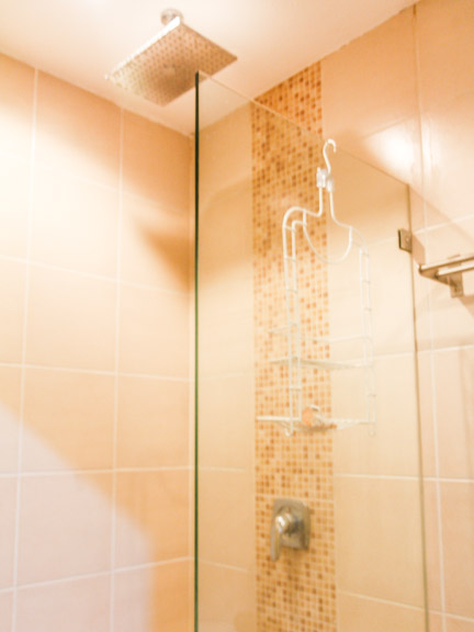• In the bathroom, a vessel sink sits on a black marble counter. Visible through the partial shower enclosure is the rainfall shower from the ceiling