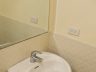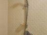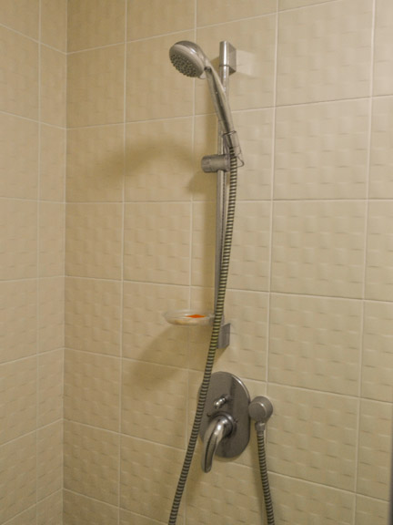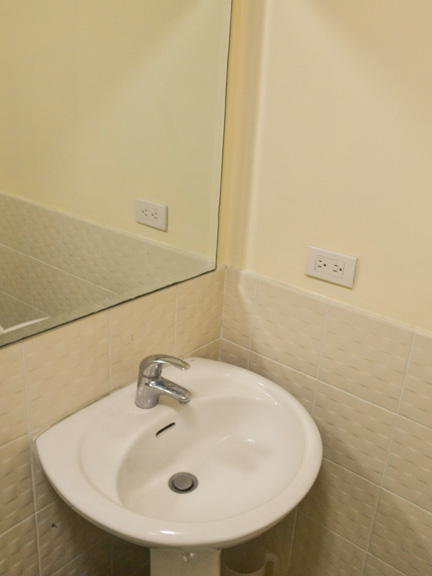 - Bathroom is equipped with a sliding bar shower head and a lovely sink next to the room