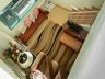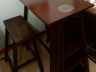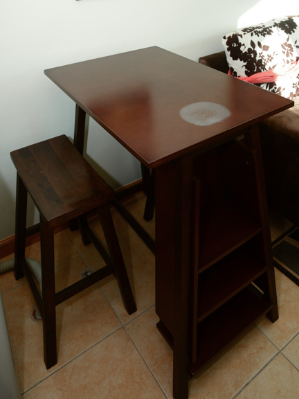 - Further in, near the washing machine is a counter-height wooden dining table with shelves and two stools