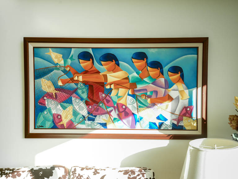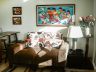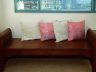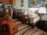 - The living room features a light-brown fabric sofa, a wooden day bed with pillows by the window, a wood-carved table drawer with the flat screen TV leaning against the stairway balustrade, and a vintage chest for a center table