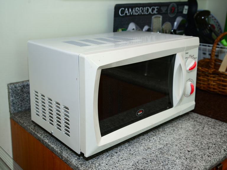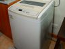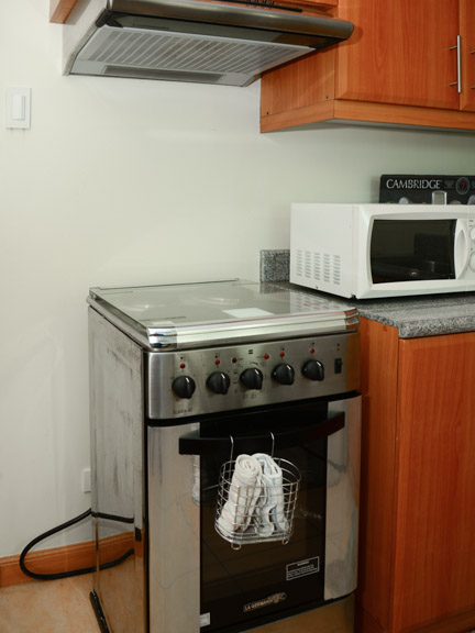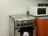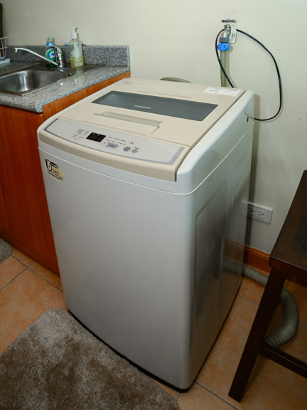 - Other appliances include a four-burner electric range with hood, a microwave, and a top-load washing machine beside the kitchen sink