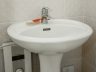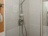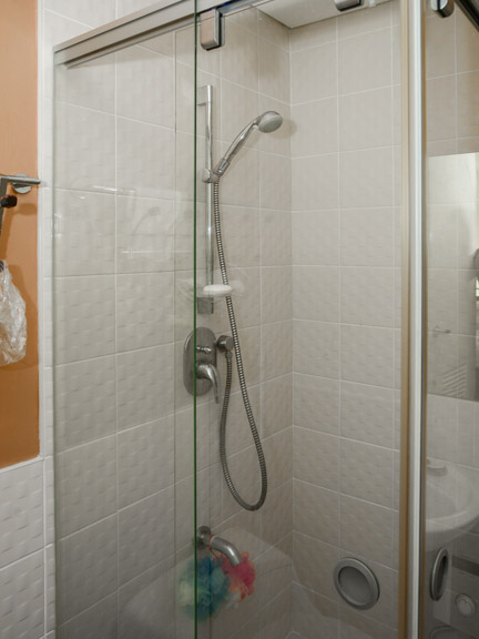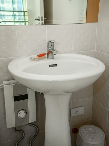 - The dainty white-tiled bathroom with a transparent glass shower enclosure has a water shower heater, a hand-held shower head, and a pedestal sink