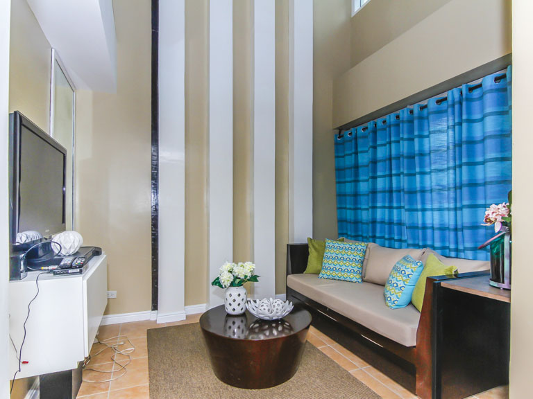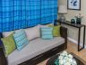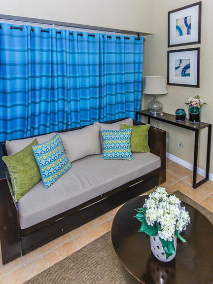 - The living room is furnished with a wooden framed fabric sofa nestled against the glass panel wall