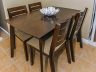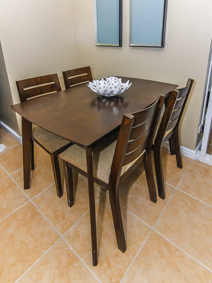 - The dining area is established by a four sitter brown wooden table and matching chairs with upholstered seats