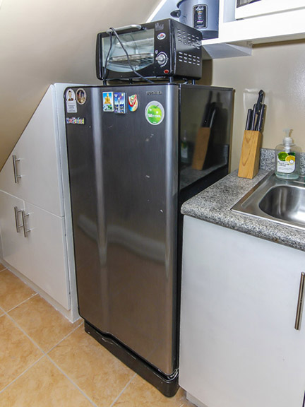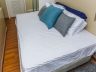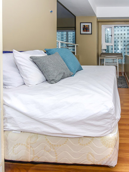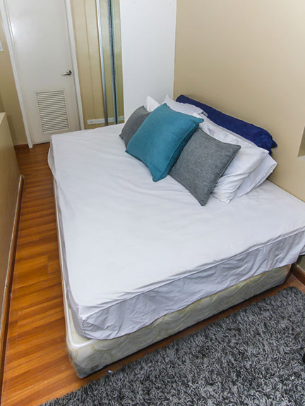 - The bedroom is furnished with a queen-sized bed pushed against the wall