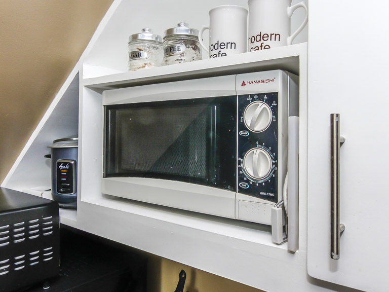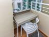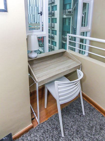 - A writing desk and chair are snuggly fitted in the corner by the window