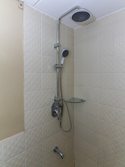 - Bathroom fittings include a fixed rainfall shower and a handheld shower