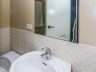 - A pedestal sink is mounted on the wall and above it is the mirror