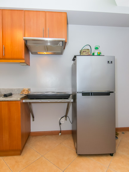 - Kitchen has a two-door refrigerator, and induction stove with hood