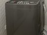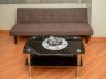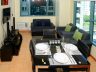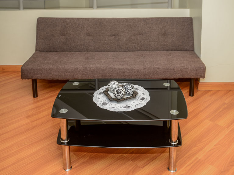 - The living room features a fabric sofa set in grey and black tones. On the floor is a grey hand-tufted area rug, and across the single armchairs is a three-layered dark glass media unit