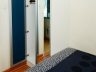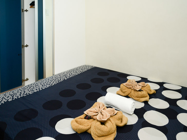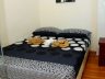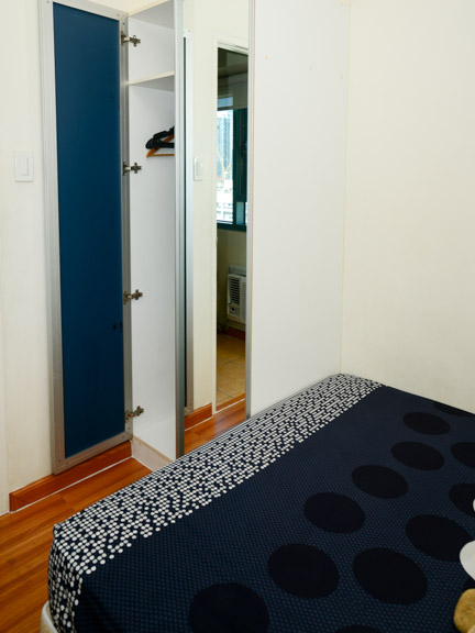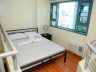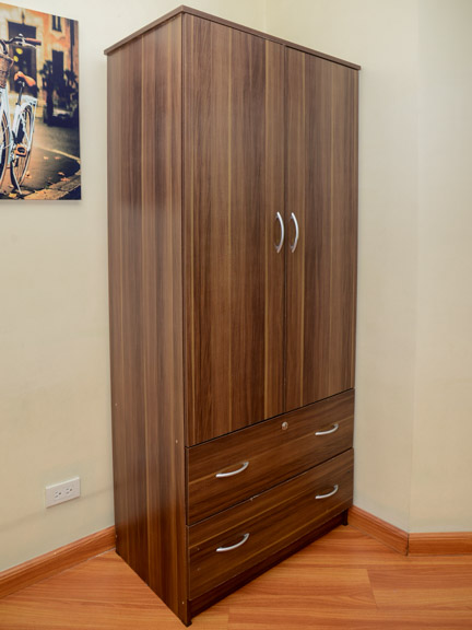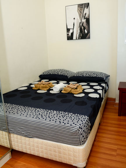 - The first level bedroom features a queen-sized corner bed and a bedside drawer, and a built-in cabinet
