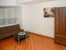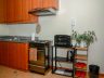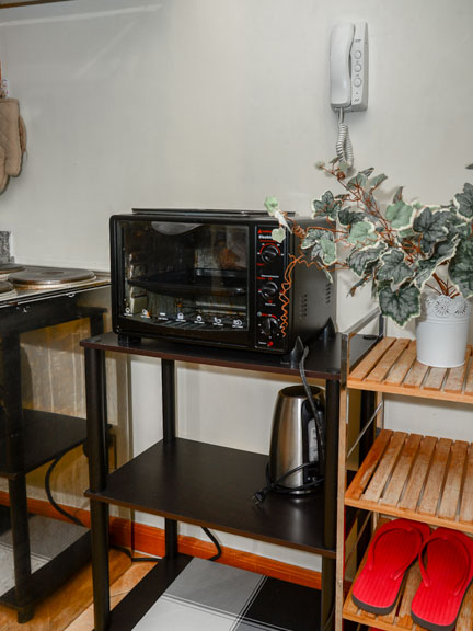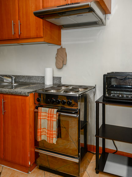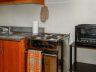 - Honey-colored cupboards, and base cabinets under grey kitchen counter-tops define the single-walled kitchen