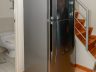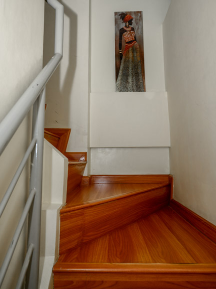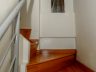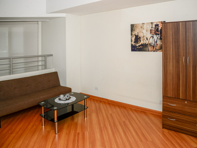 - Grey metal railings and shiny wooden steps lead to the upstairs loft with a queen-sized metal-framed bed, a bedside drawer, a corner vinyl-coated cabinet, and a multi-seater brown fabric sofa