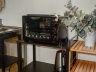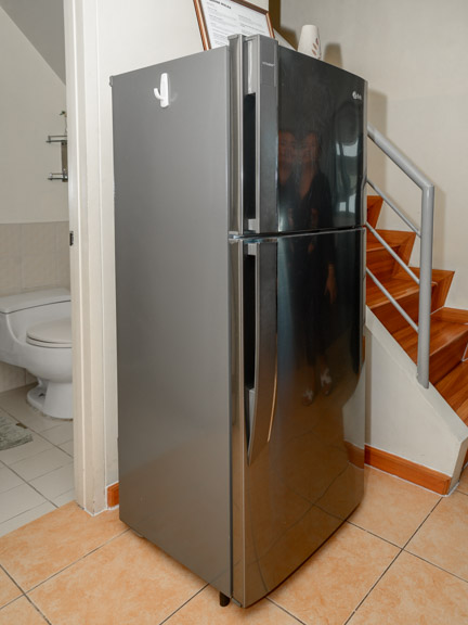 - Kitchen essentials include a single sink with a drain board, a four-burner electric range with hood, a two-door refrigerator and a microwave