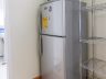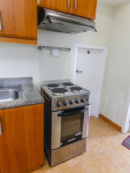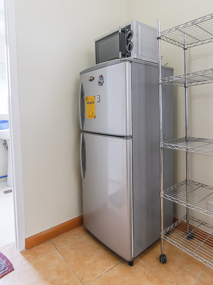 - Kitchen fitted with two-door fridge, electric range with hood, and microwave oven