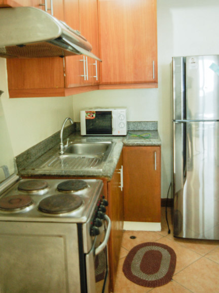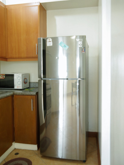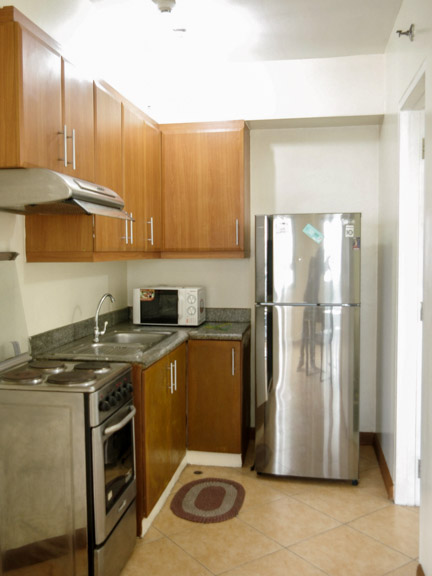 - Kitchen basics are provided including a free-standing refrigerator, cooking range with range hood on top, a microwave oven, and kitchen cabinets