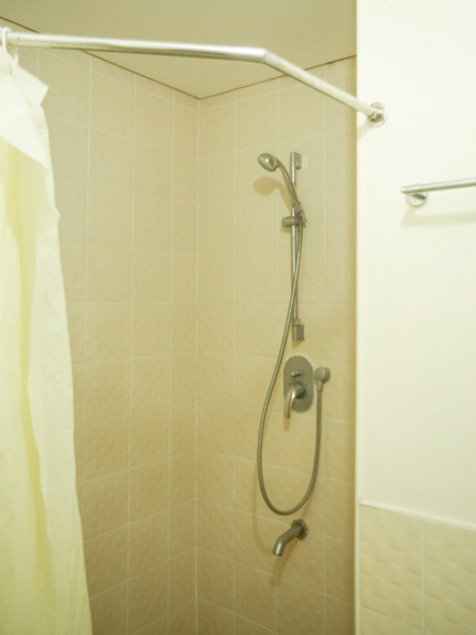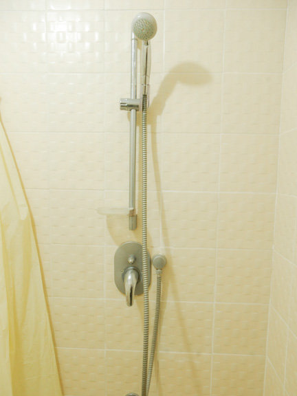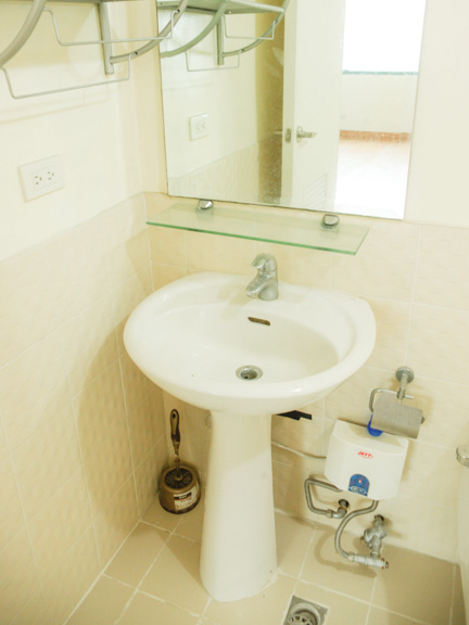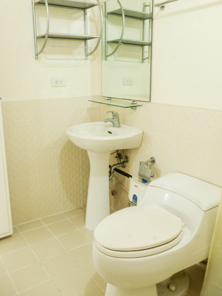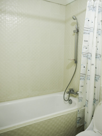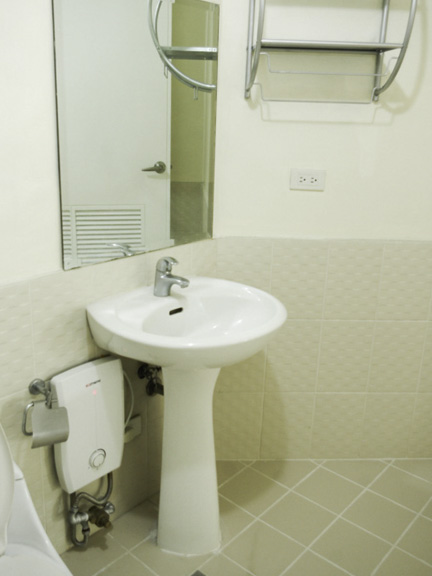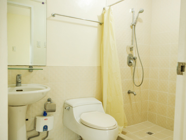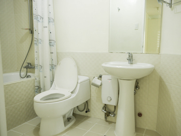 - The bathroom comes up with a water heater on each room to enjoy every bathtime, and a floating glass shelves to place your toiletries
