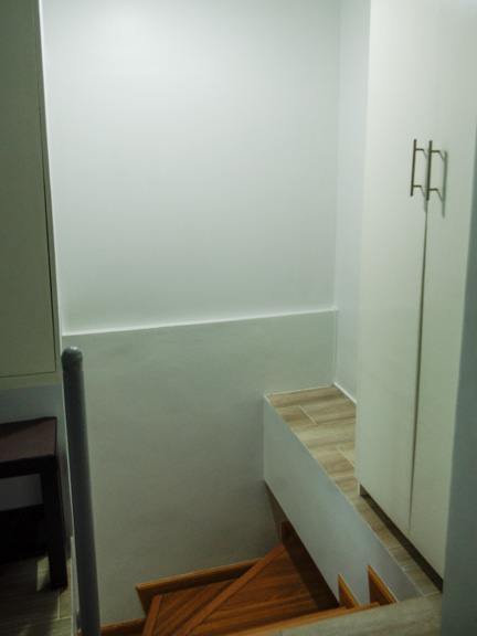 - Living room is located at the top of the stairs with a 3-seater couch, and flat screen TV