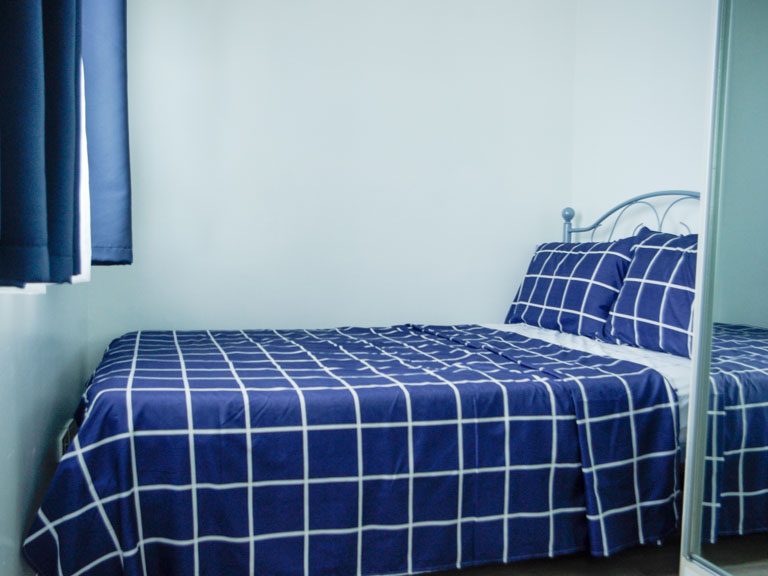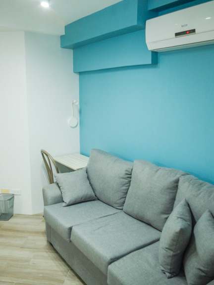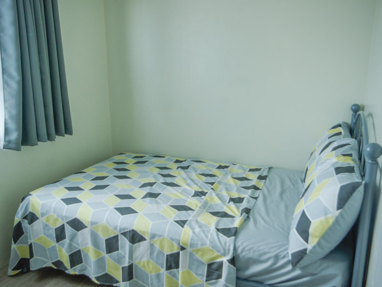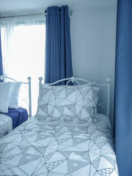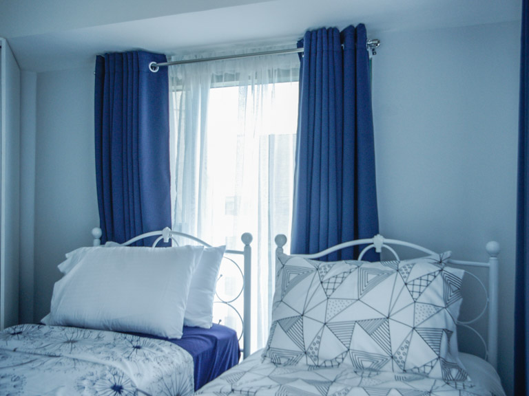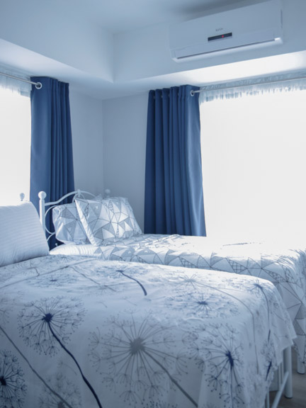 - Two bedrooms adjacent to the living room, the first with a full twin bed, the second with two single beds, each cooled by split-type air-conditioning