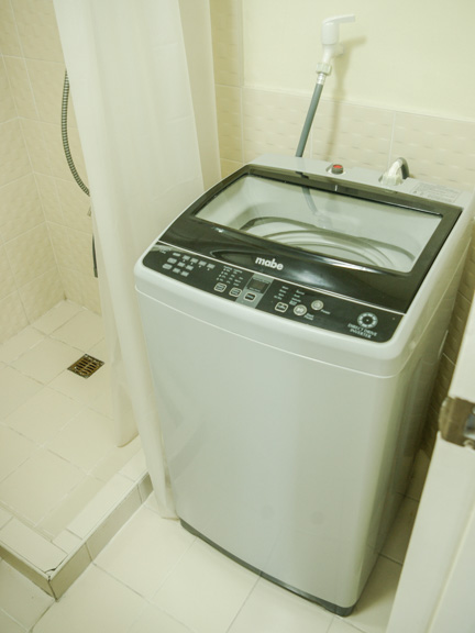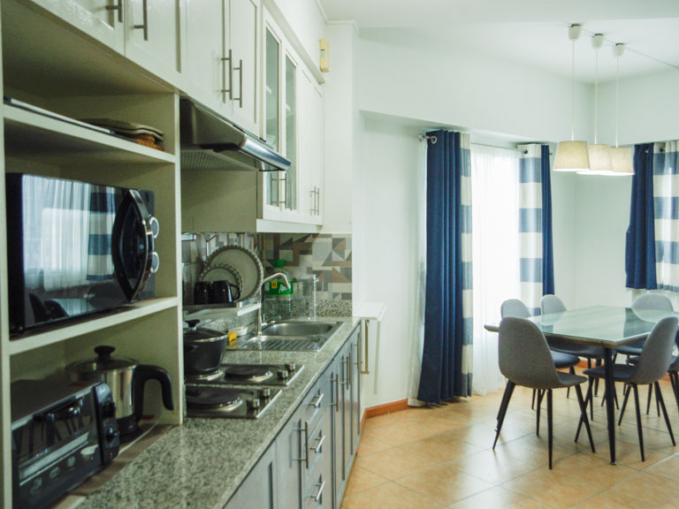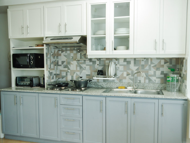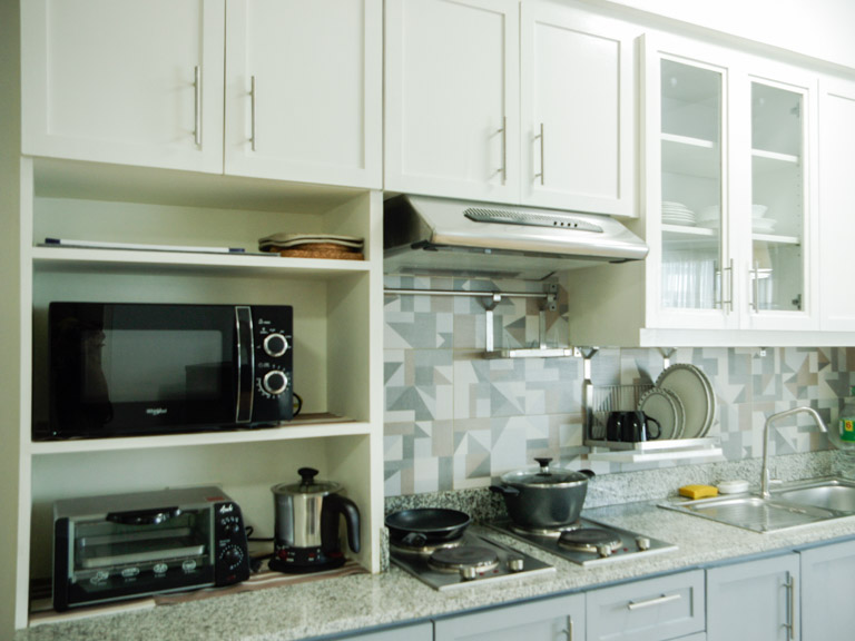 - Kitchen is situated along the wall next to the front door, and is nicely designed with decorative tiled wall, and is fitted with an electric range with range hood, microwave, oven toaster, and refrigerator