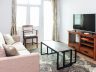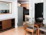 - In the bedroom, a queen-sized upholstered bed with a headboard is flanked by bedside drawers with table lamps