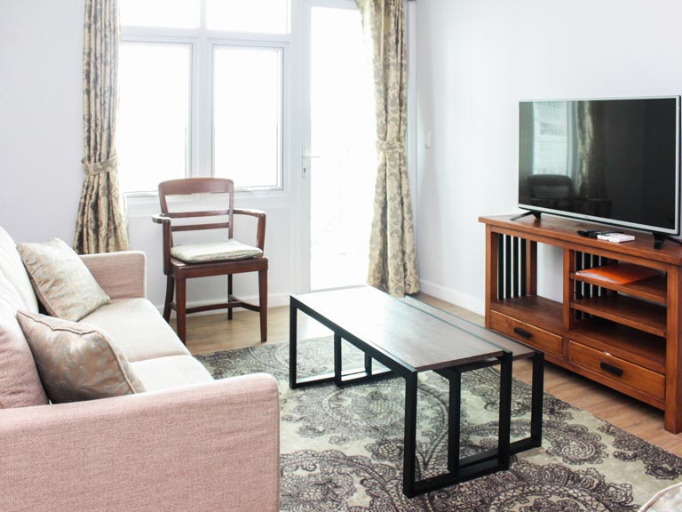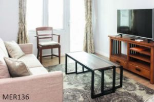 - Further in, the bright living room features a metal framed fabric sofa, two rectangular nesting tables on an area rug, a syrup-colored wooden media unit with shelves and bottom cabinets and the flat screen TV. By the windows is a wooden arm chair