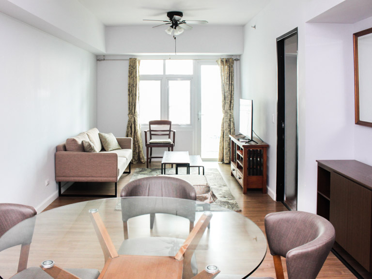 - Big windows and the glass balcony door naturally brighten the living room, which is in a continuous layout with the dining room
