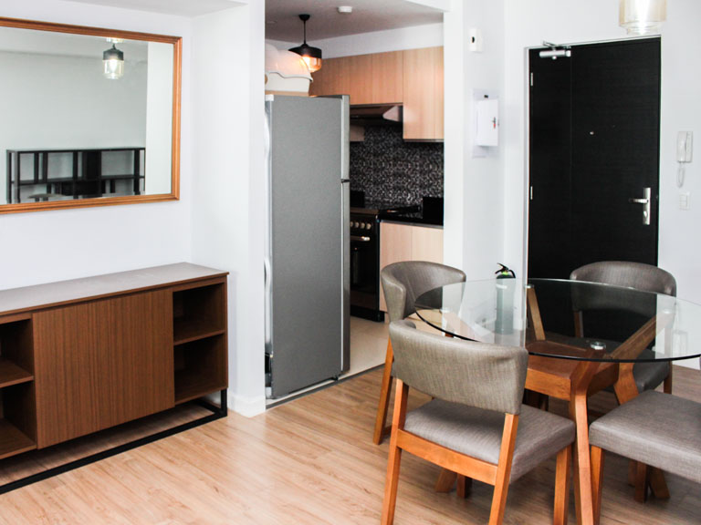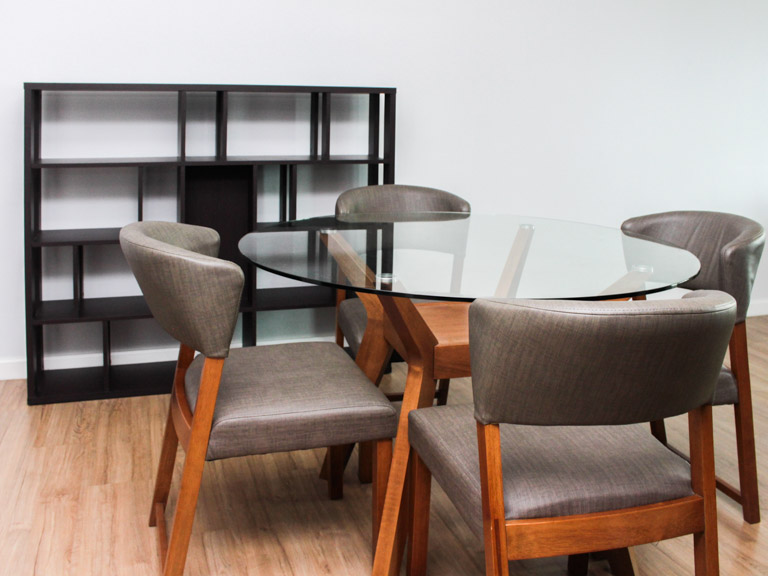 - The main door opens to the dining area furnished with a round glass table and four dining chairs. A multi-shelved wall rack is on the wall near the dining set