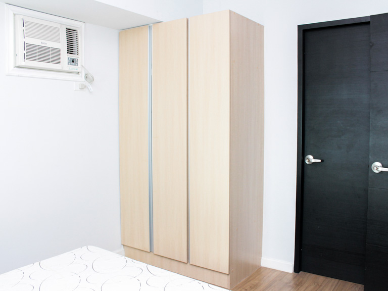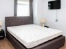 - In the corner at the foot of the bed is a vinyl-coated wardrobe cabinet. Mounted on the wall by the side of the bed is the flat screen TV